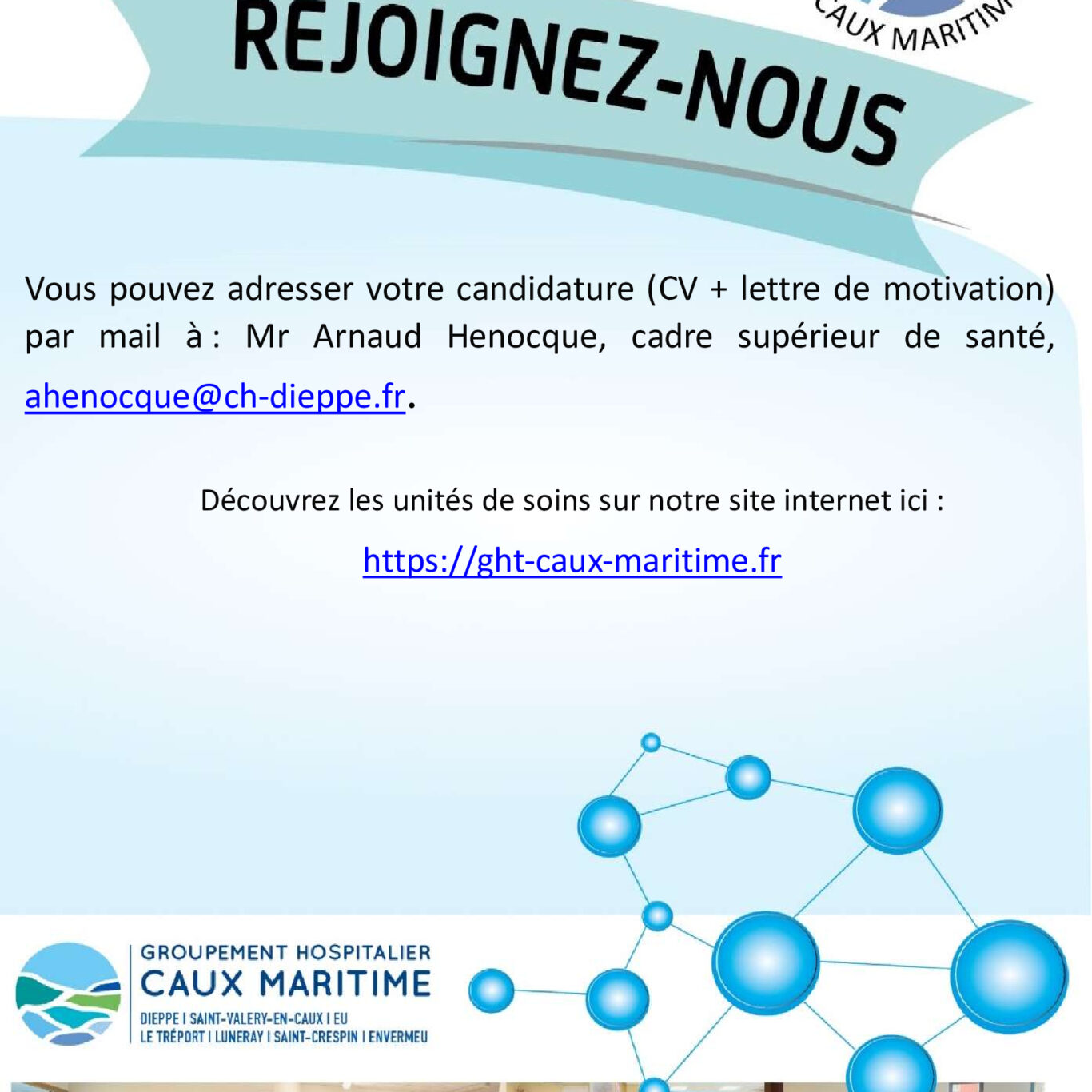 Le Centre Hospitalier de Dieppe est l’établissement support du groupement hospitalier de territoire (GHT) « Caux-Maritime » qui regroupe 3 centres hospitaliers ainsi que 4 établissements d’hébergement pour personnes âgées dépendantes (EHPAD).