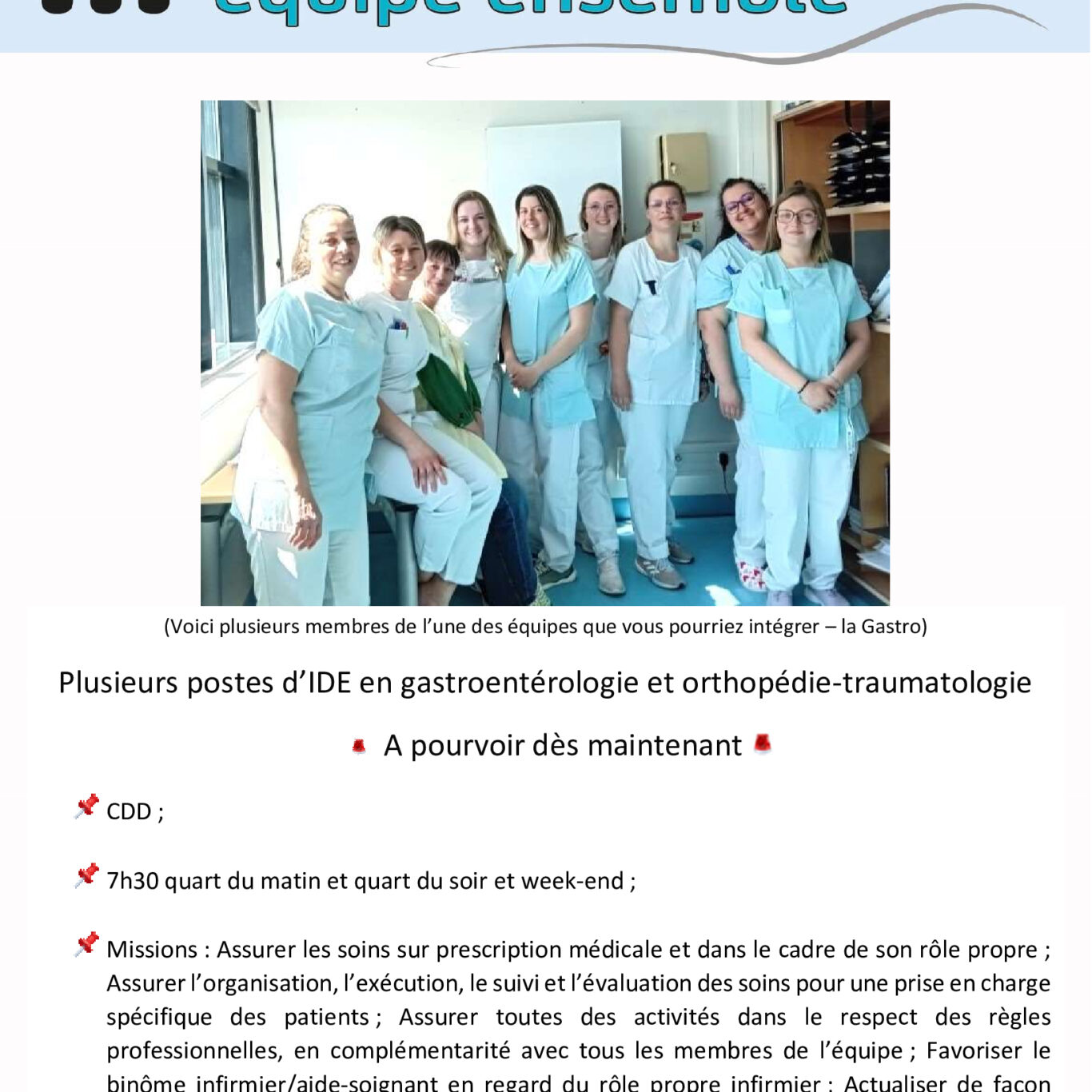 🗣 Êtes-vous prêts … 🗣… à venir faire équipe avec nous en rejoignant les équipes des services de gastroentérologie et d’orthopédie traumatologie du CH Dieppe ?L’intégralité de la fiche de poste est à retrouver ICI -