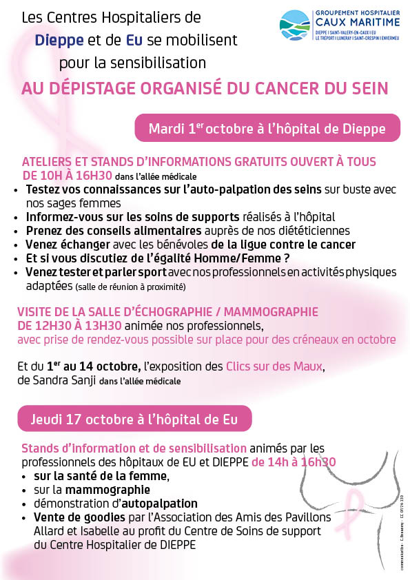 Buste d’auto palpation, visite de la salle d’Ă©chographie et de mammographie du CH Dieppe, exposition photo, vente de goodies au CH de Eu, … N’hĂ©sitez pas Ă venir nous voir et Ă prendre le temps d’Ă©changer, de poser vos questions aux professionnels prĂ©sents sur les stands.