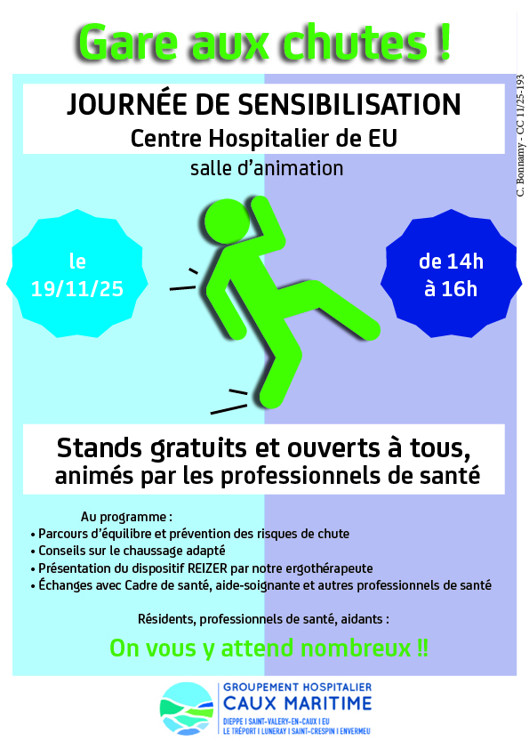 Une journée de sensibilisation aura lieu le Mercredi 19 novembre 2025 de 14h à 16h au Centre hospitalier de EU (salle d’animation), afin de vous informer sur les conséquences des chutes sur la vie quotidienne de chacun.