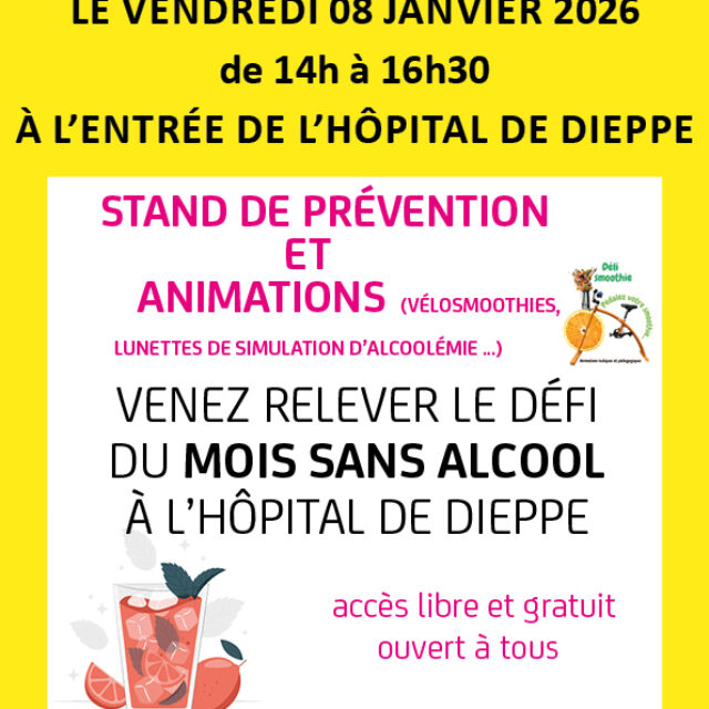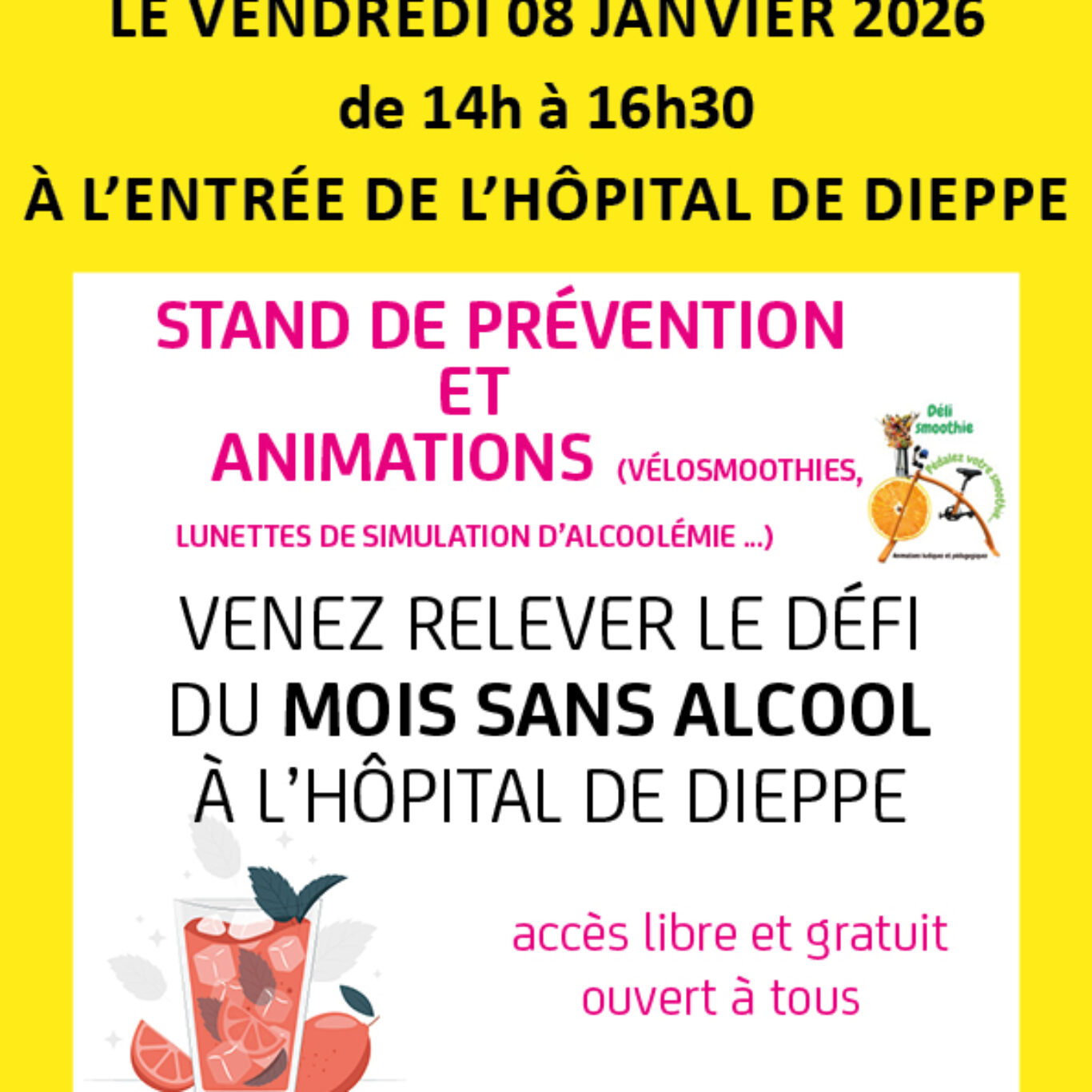 Le 08 janvier 2026 de 14h Ă 16h30, Ă l’entrĂ©e de l’hĂŽpital de Dieppe, vous seront proposĂ©s des stands, des animations vĂ©losmoothies et des lunettes de simulation d’alcoolĂ©mie afin de relever le dĂ©fi du mois sans alcool.