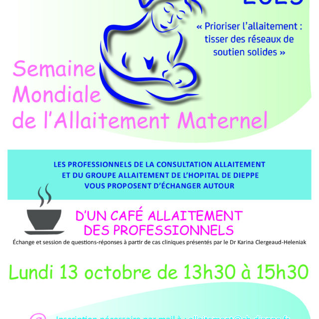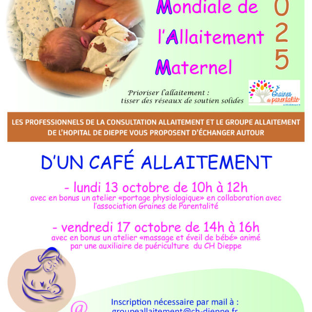 Et en bonus : du 13 au 20 octobre, venez dĂ©couvrir notre Expo Photo « Allaitement SMAM 2025 du GHT » dans l’AllĂ©e MĂ©dicale du CH Dieppe (entre le Pavillon Mère et Enfants et l’Imagerie mĂ©dicale).